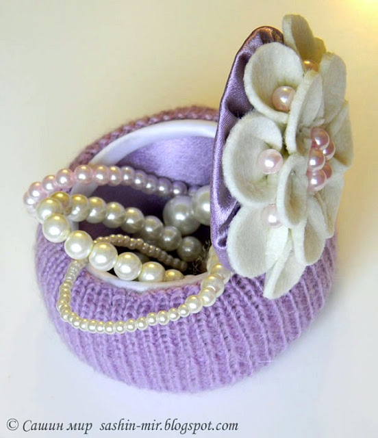 Связанный чулок примеряем на бобину, закрываем петли и крепим (термопистолетом) ко дну шкатулки, а затем и сверху. (Для чулка я набирала 100 петель и вязала резинкой 1х1.)