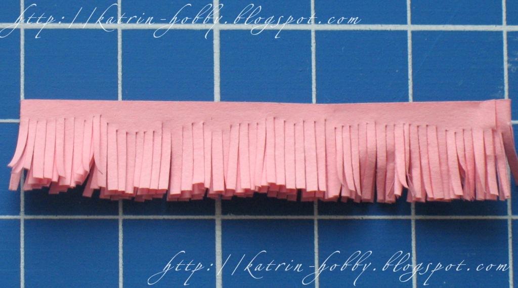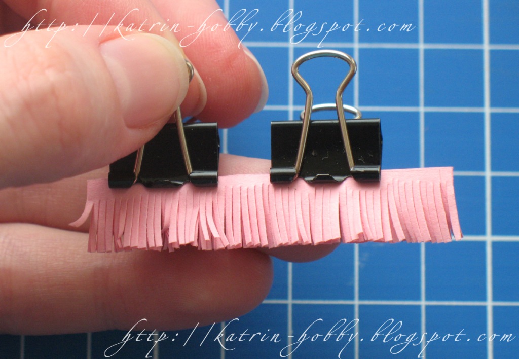 Берем полоску бумаги шириной 10 мм. Разрезаем пополам. Складываем в три раза. В места загиба делаем надрезы со стороны нарезания бахромы. Закрепляем зажимами для бумаги (что позволяет заготовке не смещаться во время нарезания) и аккуратно начинаем нарезать бахрому.